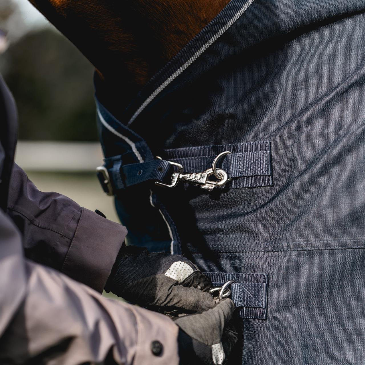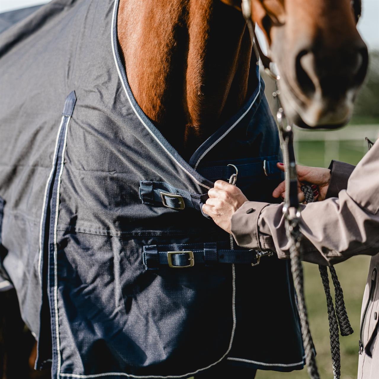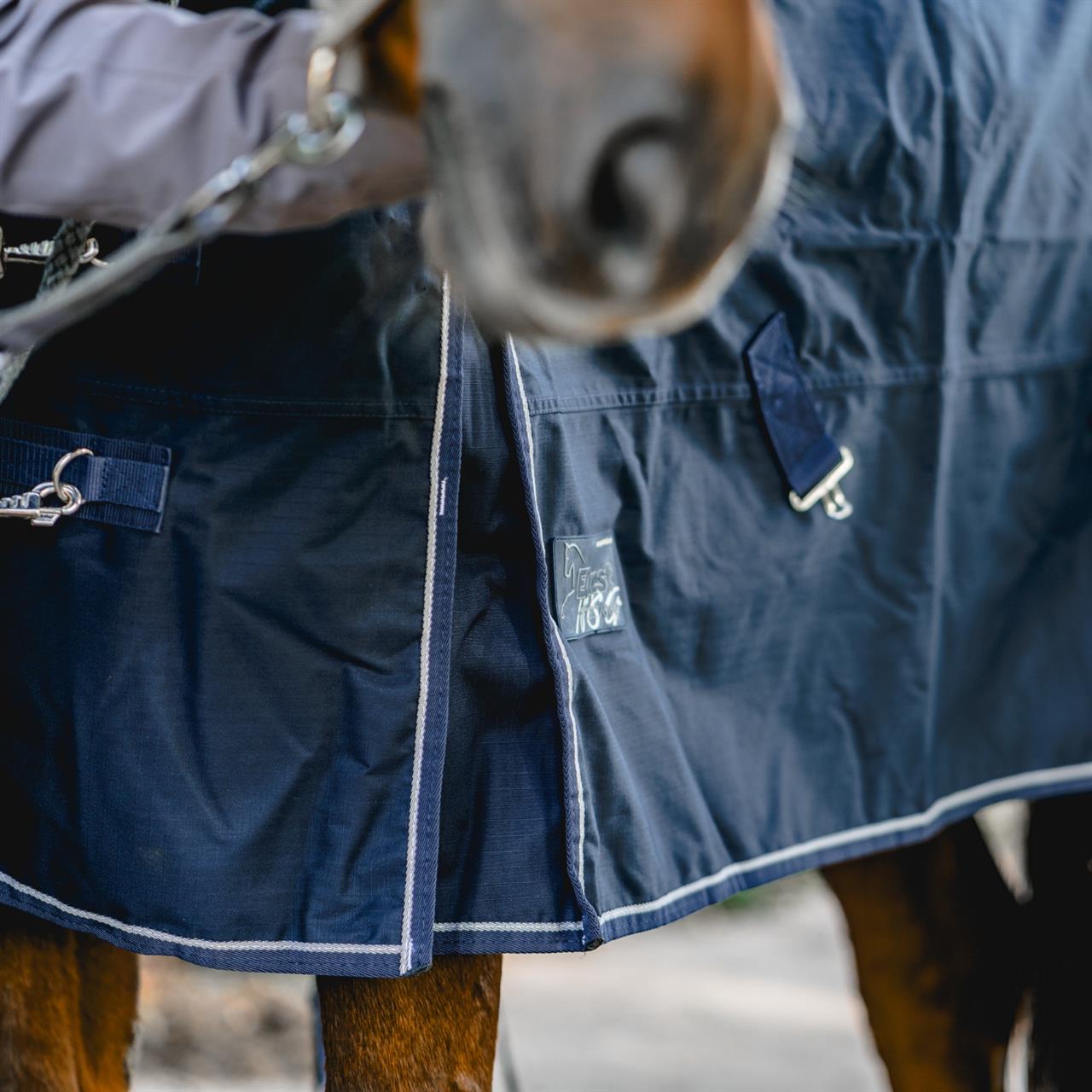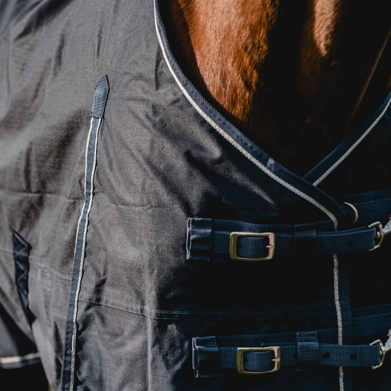 The 600 Denier outdoor rug protects your horse from wind and weather, as the waterproof and breathable material provides good temperature control and protects against the elements. Robust cross surcingles, inside leg straps and two size-adjustable front closures guarantee optimum fit. The front gusset provides generous of freedom of movement.